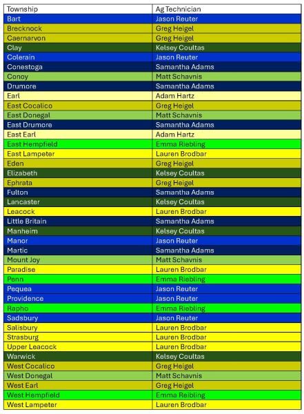 Bart Township, Colerain Township, Manor Township, Millersville Borough, Pequea Township, Providence Township, Quarryville Borough, Sadsbury Township,